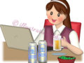 自宅のパソコンでオンライン飲み会をしている人やキャラクターのイラスト。